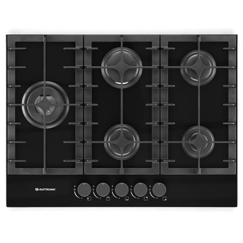 Cooktop a Gás Vidro Temperado Preto Elettromec Vetro 70cm Bivolt - 5 Queimadores Defendi, Dual Flame 4kW, Trempe Ferro Fundido, Válvula de Segurança